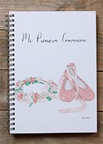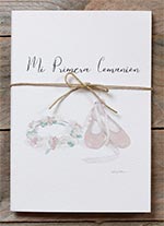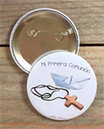 Pack de 5 chapas con alfiler con el diseño de primera comunión de este año: las bailarinas y la corona de flores en tono rosa palo. Chapas redondas con alfiler de 50mm acabado mate.