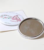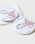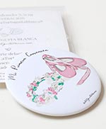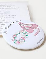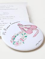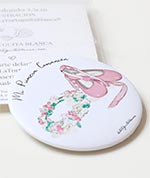 Una chapa con espejo con el diseño de primera comunión de este año: las bailarinas y la corona de flores en tonos rosa maquillaje. Chapa redonda con espejo de 75mm acabado mate.