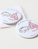 Una chapa con alfiler con el diseño de primera comunión de este año: las bailarinas y la corona de flores en tono rosa maquillaje. Chapa redonda con alfiler de 50mm acabado mate.