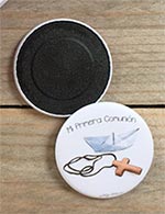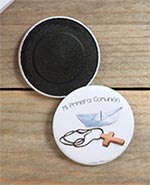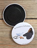 Una chapa con iman con el diseño de primera comunión de este año: las bailarinas y la corona de flores en tono rosa palo. Chapa redonda con iman de 50mm acabado mate.