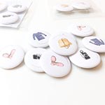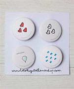 Chapas para dar un toque de original a tu cojín, a tu totebag, a tu chaqueta, a tu gorro a tu neceser… Unos corazones rojos de la ilustración TE QUIERO, unos corazones blancos de la ilustración MOON, unos peces azules y un globo verde que se escapan de UN